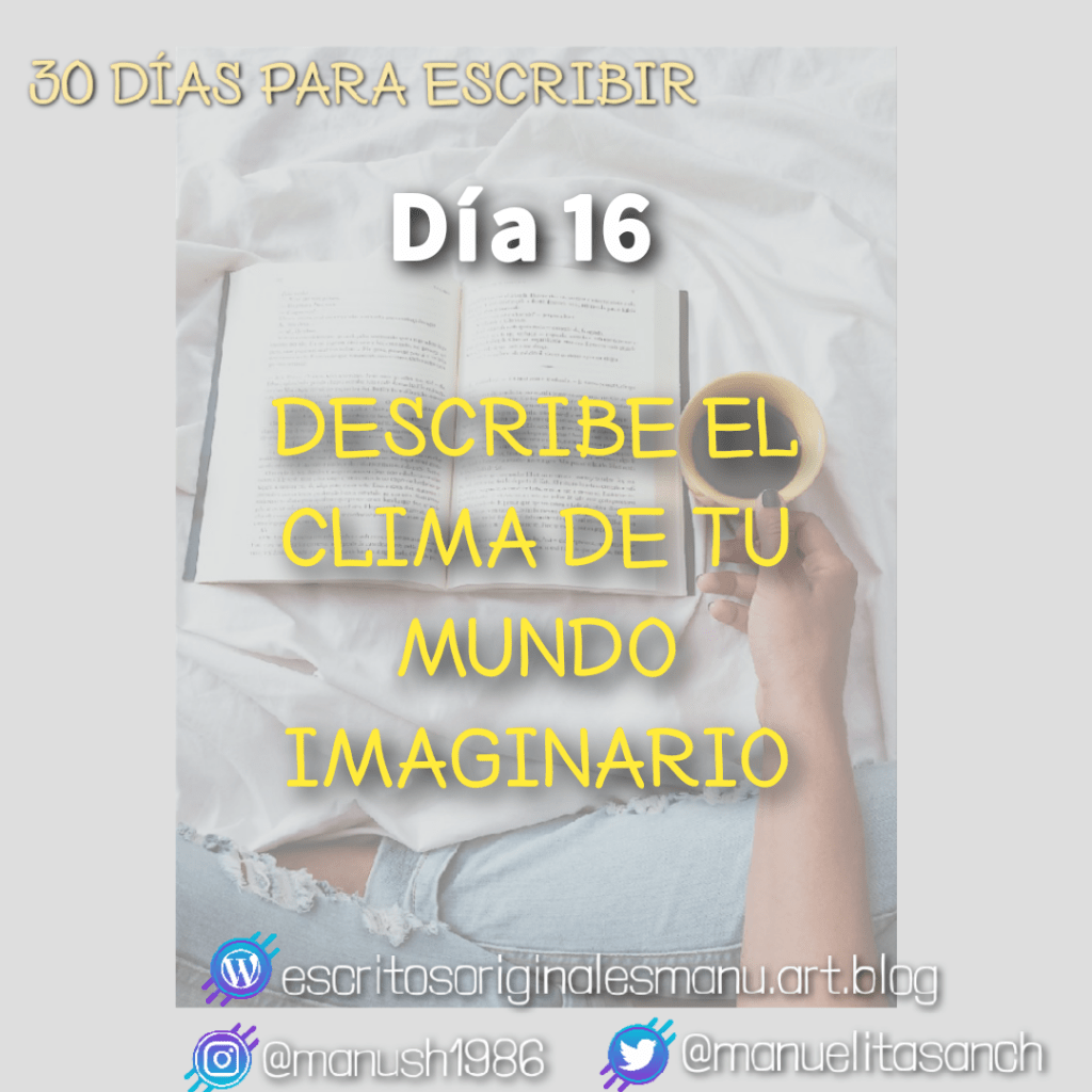 Empecemos por lo simple: ¿cómo sería el clima de tu mundo imaginario? ¿Hay estaciones? ¿Llueve? ¿Temperatura promedio? ¿Hay auroras boreales, sol de medianoche? ¿Es húmedo, seco? Descríbelo, imaginate un día en ese clima, y si querés seguir con el ejercicio de construir el mundo, piensa en los paisajes y en cómo sería tu casa.